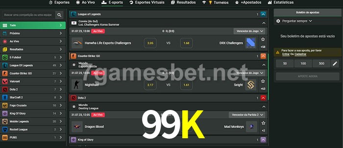 O 99K oferece uma grande seleção de opções de apostas em e-sports com probabilidades competitivas